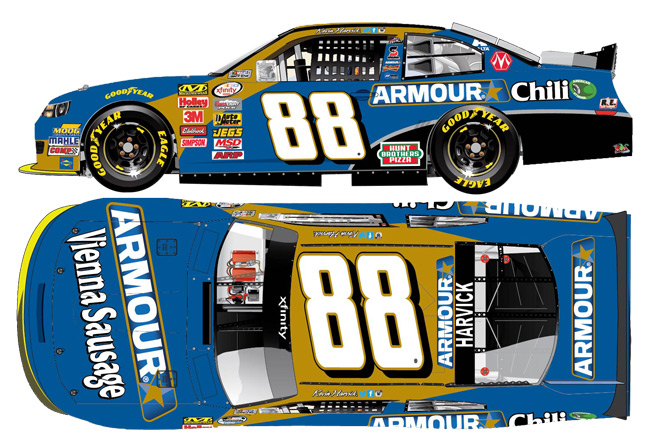 2015 Kevin Harvick #88 Armour Vienna Sausage / Chevrolet SS NASCAR 1/64 diecast, by Action. The JR Motorsports #88 Armour Vienna Sausage Chevrolet Camaro was raced by Kevin Harvick in the NASCAR xfinity Series, Kansas Lottery 300 at Kansas Speedway on October 17, 2015.
