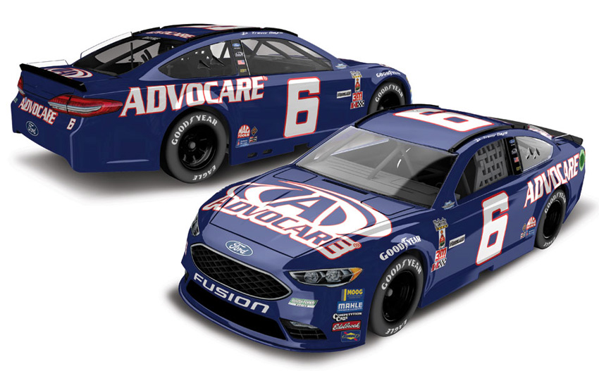 2017 Trevor Bayne #6 AdvoCare / Darlington / Ford Fusion NASCAR diecast, by Action. The Roush Fenway Racing #6 AdvoCare Darlington Ford was raced by Trevor Bayne in the Monster Energy NASCAR Cup, Bojangles' Southern 500 at Darlington Raceway on September 3, 2017. This retro paint scheme will pay tribute to a driver from the 1980's.