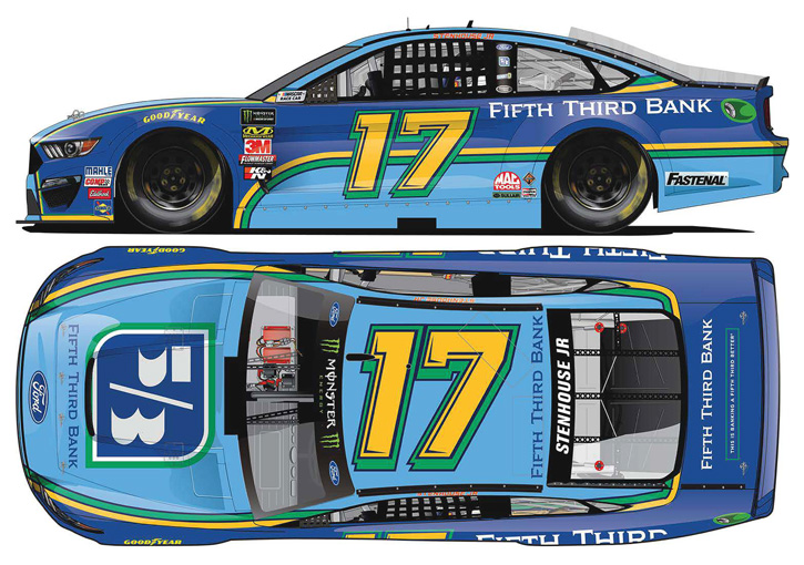 2019 Ricky Stenhouse Jr #17 Fifth Third Bank / Ford Mustang NASCAR 1/64 diecast, by Action Lionel. The Roush Fenway Racing #17 Fifth Third Bank Ford Mustang was raced by Ricky Stenhouse Jr in select events during the 2019 Monster Energy NASCAR Cup season. This diecast car will not have the Monster Energy decal on the windshield.