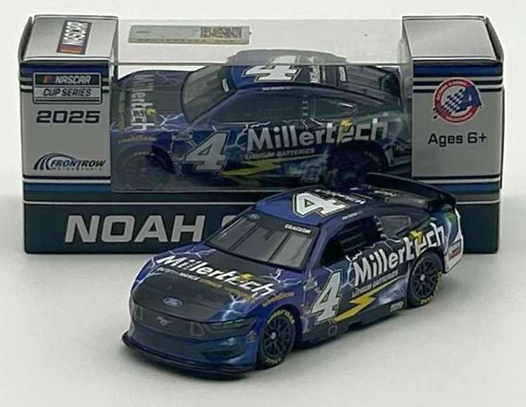2025 Noah Gragson #4 Millertech / Ford Mustang NASCAR 1/64 diecast, by Action Lionel. The Front Row Motorsports #4 Millertech Performance Lithium Batteries Ford Mustang will be raced by Noah Gragson in several events during the 2025 NASCAR Cup season.