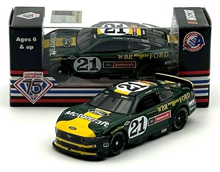 2025 Josh Berry #21 Motorcraft / Darlington Throwback / Ford Mustang NASCAR 1/64 diecast, by Action Lionel. The Wood Brothers Racing #21 Motorcraft Darlington Throwback Ford Mustang was raced by Josh Berry in the NASCAR Cup, Goodyear 400 at Darlington Raceway on April 6, 2025. This throwback replicates Jim Clark's 1965 Indianapolis 500 winning livery, which was pitted by the Wood Brothers.