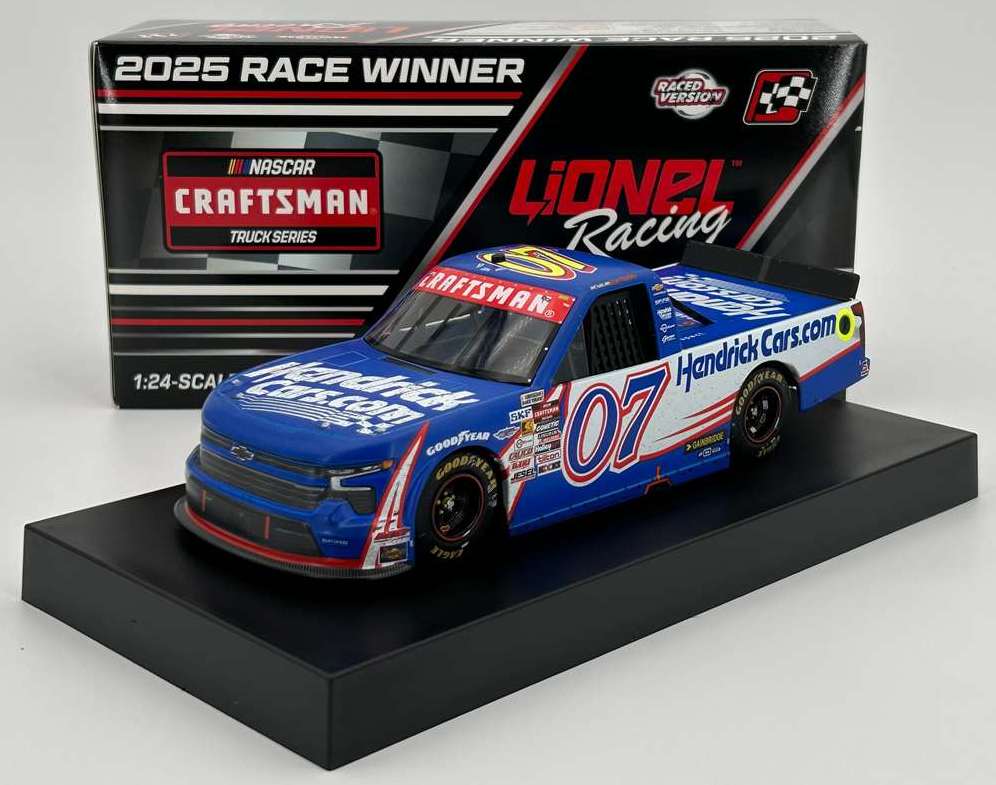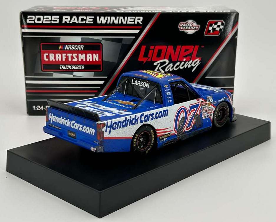 2025 Kyle Larson #07 HendrickCars.com / Homestead Win / Raced Version / Chevrolet Silverado NASCAR Truck 1/24 diecast, by Action Lionel. Kyle Larson raced this Spire Motorsports #07 HendrickCars.com Chevrolet Silverado to victory in the NASCAR Craftsman Truck Series, Baptist Health 200 at Homestead-Miami Speedway on March 21, 2025.