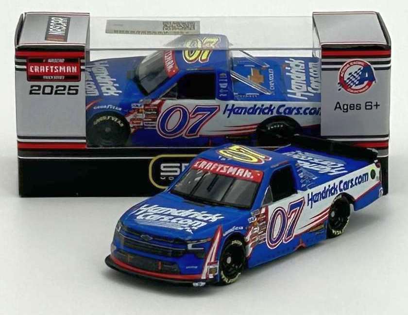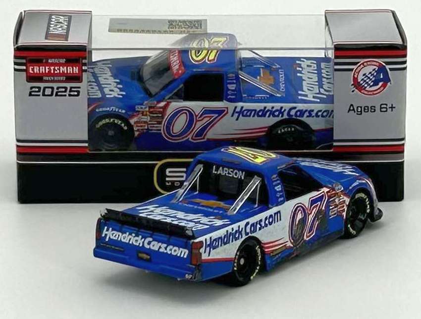 2025 Kyle Larson #07 HendrickCars.com / Homestead Win / Raced Version / Chevrolet Silverado NASCAR Truck 1/64 diecast, by Action Lionel. Kyle Larson raced this Spire Motorsports #07 HendrickCars.com Chevrolet Silverado to victory in the NASCAR Craftsman Truck Series, Baptist Health 200 at Homestead-Miami Speedway on March 21, 2025.