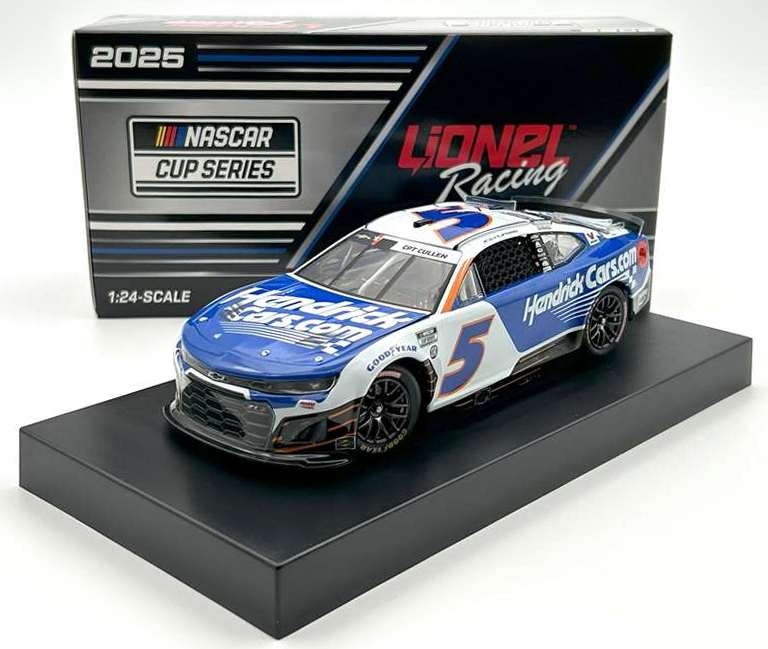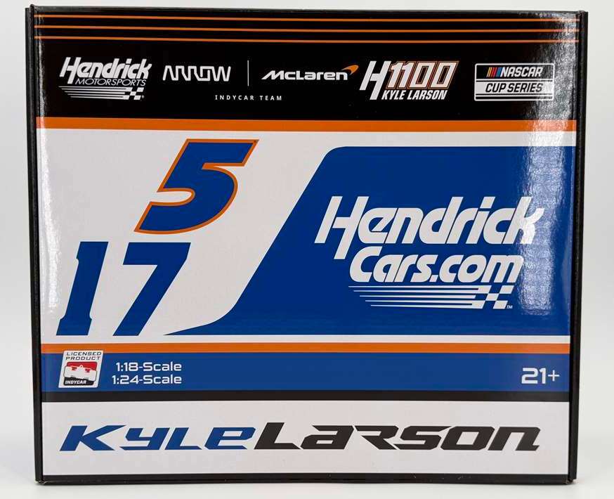 2025 Kyle Larson Hendrick 1100 2-Car Diecast Set, by Action Lionel, in partnership with GreenLight Collectables. For the 2nd straight year, Kyle Larson raced both the Indianapolis 500 and Coca-Cola 600. This 2-car set includes a 2025 Kyle Larson #5 HendrickCars.com H100 / Chevrolet Camaro ZL1 NASCAR 1/24 diecast, by Action Lionel, and 2025 Kyle Larson #17 HendrickCars.com / Arrow McLaren Chevrolet NTT IndyCar 1/18, by GreenLight. --