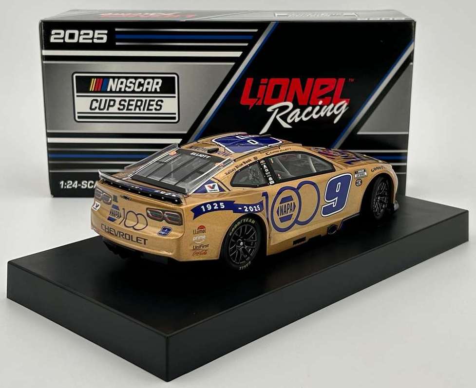 2025 Chase Elliott #9 NAPA Gold / Chevrolet Camaro ZL1 NASCAR 1/24 diecast, by Action Lionel. The Hendrick Motorsports #9 NAPA Auto Parts Gold 100th Anniversary Chevrolet Camaro ZL1 was raced by Chase Elliott in the NASCAR Cup, Wurth 400 presented by LIQUI MOLY at Texas Motor Speedway on May 4, 2025. This golden livery celebrates NAPA Auto Parts 100th anniversary.