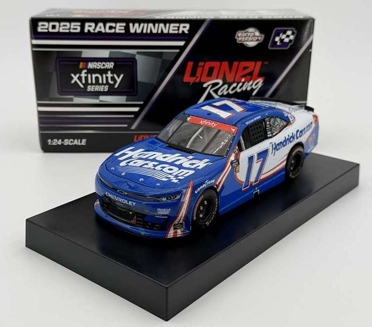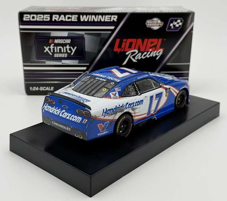 2025 William Byron #17 HendrickCars.com / Charlotte Win / Raced Version / Chevrolet Camaro NASCAR 1/24 diecast, by Action Lionel. William Byron raced this Hendrick Motorsports #17 HendrickCars.com Chevrolet Camaro to victory in the NASCAR xfinity, BetMGM 300 at Charlotte Motor Speedway on May 24, 2025.