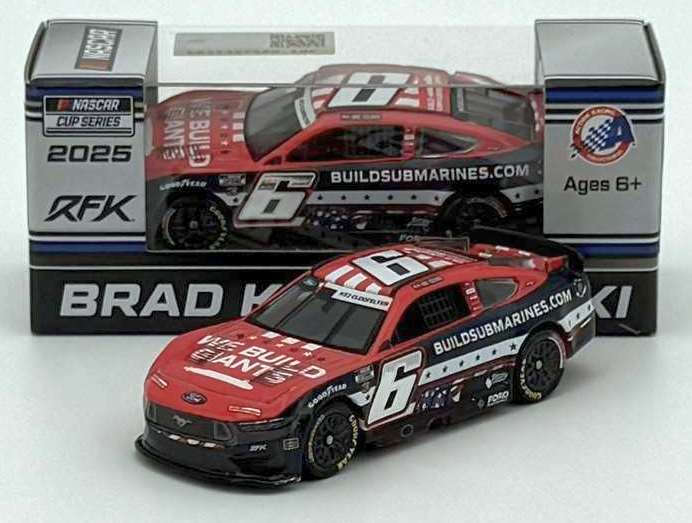 2025 Brad Keselowski #6 BuildSubmarines.com Salutes / Ford Mustang NASCAR 1/64 diecast, by Action Lionel. The RFK Roush Fenway Keselowski Racing #6 BuildSubmarines.com Salutes Ford Mustang was raced by Brad Keselowski in the NASCAR Cup, Coca-Cola 600 at Charlotte Motor Speedway on May 25, 2025. This is a foil number car.
