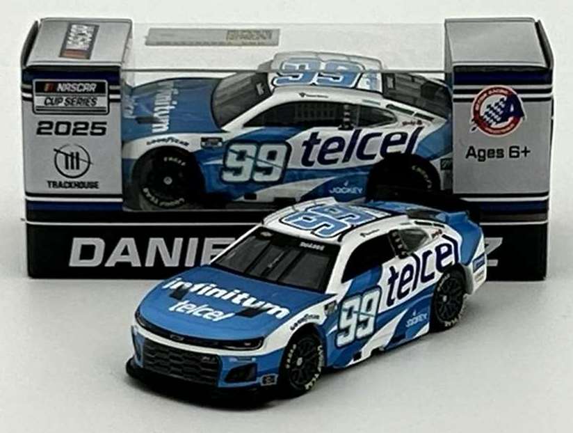 2025 Daniel Suarez #99 Telcel / Chevrolet Camaro ZL1 NASCAR 1/64 diecast, by Action Lionel. The Trackhouse Racing #99 Telcel Chevrolet Camaro ZL1 was raced by Daniel Suarez in the NASCAR Cup, Viva Mexico 250 at Autodromo Hermanos Rodriguez in Mexico City on June 15, 2025.