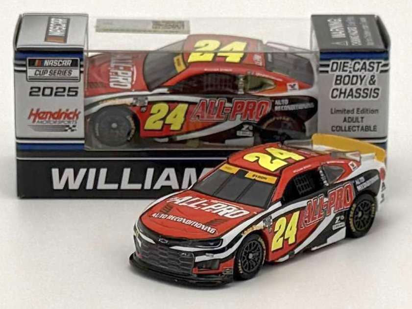 2025 William Byron #24 All-Pro / Chevrolet Camaro ZL1 NASCAR 1/64 diecast, by Action Lionel. The Hendrick Motorsports #24 All-Pro Auto Reconditioning Chevrolet Camaro ZL1 was raced by William Byron in the NASCAR Cup races at Chicago in July and Darlington in August.
