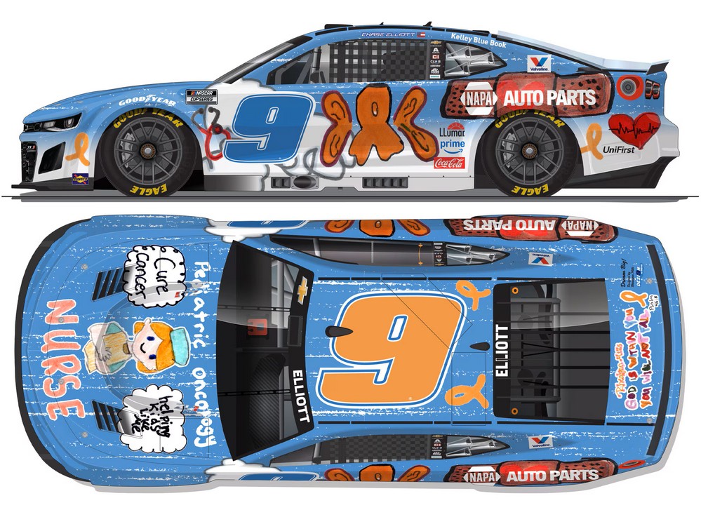 2025 Chase Elliott #9 NAPA / Children’s Healthcare of Atlanta / Chevrolet Camaro ZL1 NASCAR 1/64 diecast, by Action Lionel. The Hendrick Motorsports #9 NAPA Children’s Healthcare of Atlanta Chevrolet Camaro ZL1 was raced to victory by Chase Elliott in the NASCAR Cup, Quaker State 400 at Atlanta's Echopark Speedway on June 28, 2025. This livery was designed by a patient at Children’s Healthcare of Atlanta as part of the DESI9N TO DRIVE program.