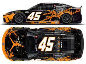 2025 Tyler Reddick #45 Jordan Brand Chicago / Toyota Camry XSE NASCAR 1/64 diecast, by Action Lionel. The 23XI Racing #45 Jordan Brand Chicago Toyota Camry XSE was raced to a 3rd place finish by Tyler Reddick in the NASCAR Cup, Grant Park 165 at the Chicago Street Course on July 6, 2025. Tyler Reddick battled for the win with a shattered backboard-themed Jordan Brand livery.