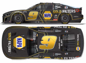 2025 Chase Elliott #9 NAPA Gold Filters / Chevrolet Camaro ZL1 NASCAR 1/24 diecast, by Action Lionel. The Hendrick Motorsports #9 NAPA Auto Parts Gold Filters Chevrolet Camaro ZL1 was raced by Chase Elliott in the NASCAR Cup, Grant Park 165 at the Chicago Street Course on July 6, 2025.