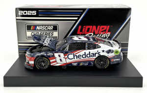 2025 Kyle Busch #8 Cheddar's Salutes / Chevrolet Camaro ZL1 NASCAR 1/24 diecast, by Action Lionel. The Richard Childress Racing #8 Cheddar's Scratch Kitchen Salutes Chevrolet Camaro ZL1 was raced by Kyle Busch in select events during the 2025 NASCAR Cup season. This patriotic special paint scheme salutes America’s military members.