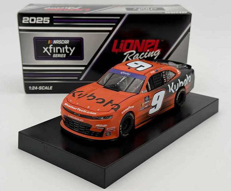 2025 Shane Van Gisbergen #9 Kubota / Chevrolet Camaro NASCAR 1/24 diecast, by Action Lionel. The JR Motorsports #9 Kubota Chevrolet Camaro was raced by Shane Van Gisbergen in the NASCAR xfinity Series, Mission 200 at Watkins Glen International on August 9, 2025. --