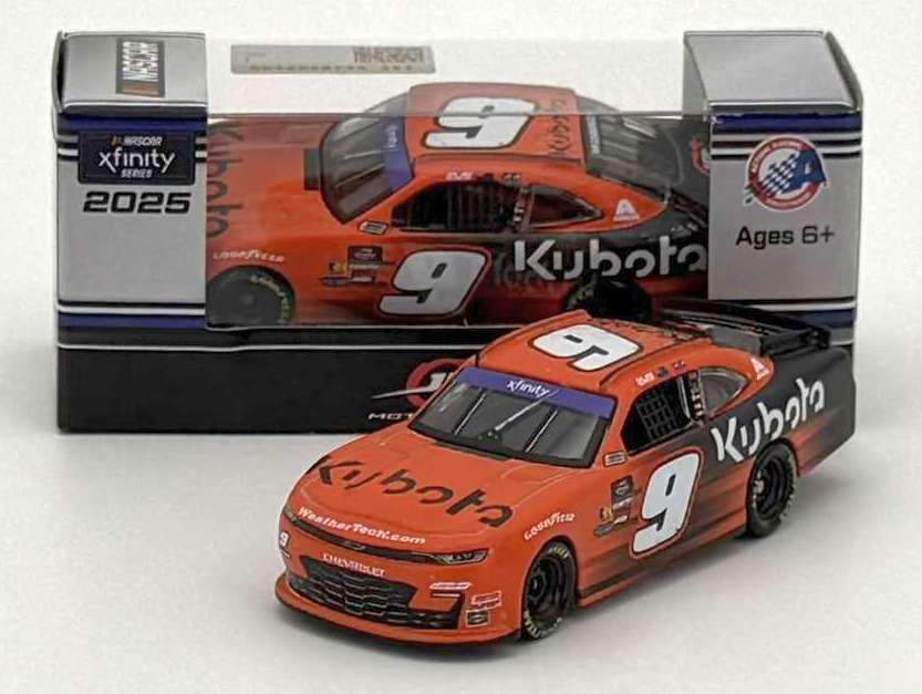 2025 Shane Van Gisbergen #9 Kubota / Chevrolet Camaro NASCAR 1/64 diecast, by Action Lionel. The JR Motorsports #9 Kubota Chevrolet Camaro was raced by Shane Van Gisbergen in the NASCAR xfinity Series, Mission 200 at Watkins Glen International on August 9, 2025.