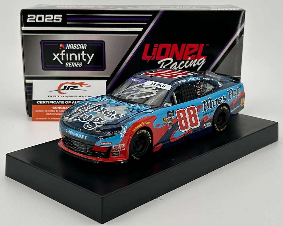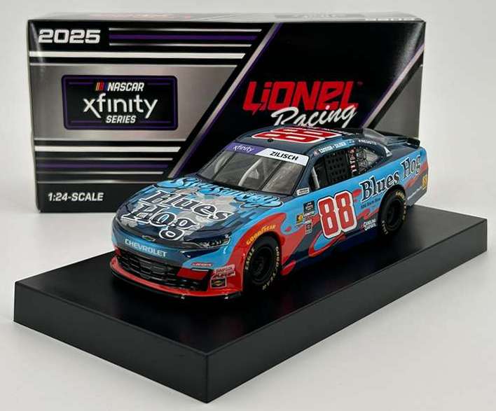 2025 Connor Zilisch #88 Blues Hog / Chevrolet Camaro NASCAR 1/24 diecast, by Action Lionel. The JR Motorsports #88 Blues Hog Chevrolet Camaro was raced by Connor Zilisch in select events during the 2025 NASCAR xfinity Series season.