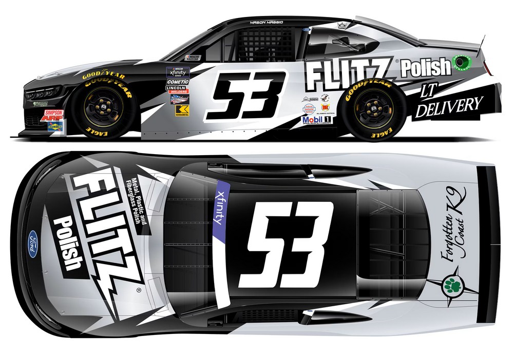 2025 Mason Maggio #53 Flitz Polish / Ford Mustang NASCAR 1/64 diecast, by Action Lionel. The Joey Gase Racing #53 Flitz Polish Ford Mustang will be raced by Mason Maggio during the 2025 NASCAR xfinity Series season.