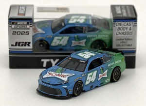 2025 Ty Gibbs #54 Sonic / Grillo's Pickles / Toyota Camry XSE NASCAR 1/64 diecast, by Action Lionel. The Joe Gibbs Racing #54 Sonic Grillo's Pickles Toyota Camry XSE was raced by Ty Gibbs in the NASCAR Cup, Quaker State 400 at Atlanta's Echopark Speedway on June 28, 2025. "Pickle Power"
