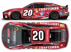 2025 Christopher Bell #20 Craftsman / Racing for a Miracle / Toyota Camry XSE NASCAR 1/64 diecast, by Action Lionel. The Joe Gibbs Racing #20 Craftsman Racing for a Miracle Toyota Camry XSE was raced by Christopher Bell in the NASCAR Cup, Grant Park 165 at the Chicago Street Course on July 6, 2025. This Craftsman livery celebrated 19 years of Stanley Black & Decker's support of the Racing for a Miracle program and the Ace Hardware Foundation. The car featured artwork designed by patients of Ann & Robert H. Lurie Children's Hospital in Chicago.