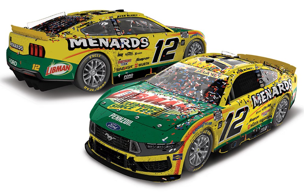 2025 Ryan Blaney #12 Menards / Libman / New Hampshire Win / Raced Version / Ford Mustang NASCAR 1/24 diecast, by Action Lionel. Ryan Blaney raced this Team Penske #12 Menards Libman Ford Mustang to victory in the NASCAR Cup, Mobil 1 301 at New Hampshire Motor Speedway on September 21, 2025. This was Ryan Blaney's 3rd NASCAR Cup Series win of the season.