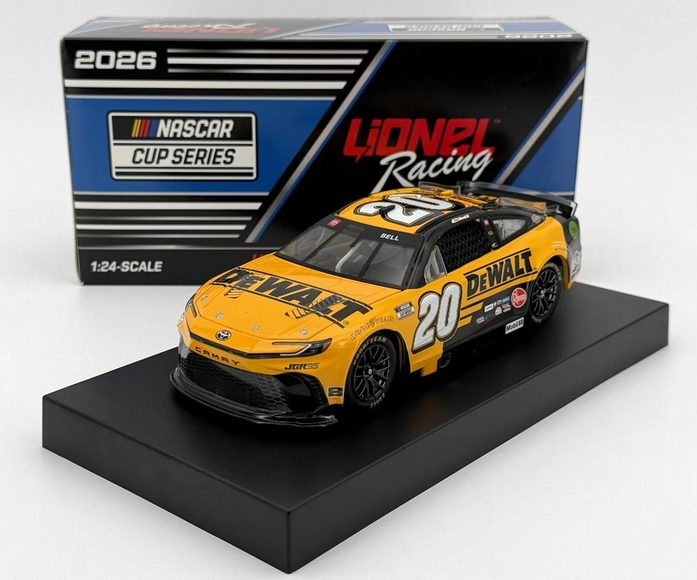 2026 Christopher Bell #20 DEWALT / Toyota Camry XSE NASCAR 1/24 diecast, by Action Lionel Racing. The Joe Gibbs Racing #20 DEWALT Toyota Camry XSE will be raced by Christopher Bell during the 2026 NASCAR Cup season.
