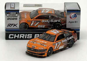 2025 Chris Buescher #17 Body Guard Mexico / Ford Mustang NASCAR 1/64 diecast, by Action Lionel Racing. The RFK Roush Fenway Keselowski Racing #17 Body Guard Mexico Ford Mustang was raced to a top-10 finish by Chris Buescher in the NASCAR Cup, Viva Mexico 250 at Mexico City's Autódromo Hermanos Rodríguez on June 15, 2025. This is a foil number car.
