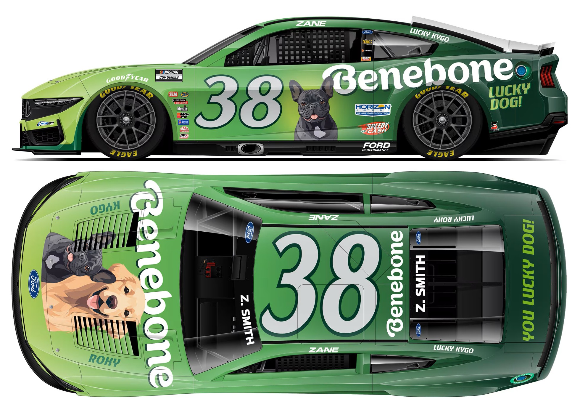 2025 Zane Smith #38 Benebone / Ford Mustang NASCAR 1/64 diecast, by Action Lionel Racing. The Front Row Motorsports #38 Benebone Ford Mustang was raced by Zane Smith in select events during the 2025 NASCAR Cup season. Zane Smith's "lucky dogs" Kygo and Roxy are featured on this ride.