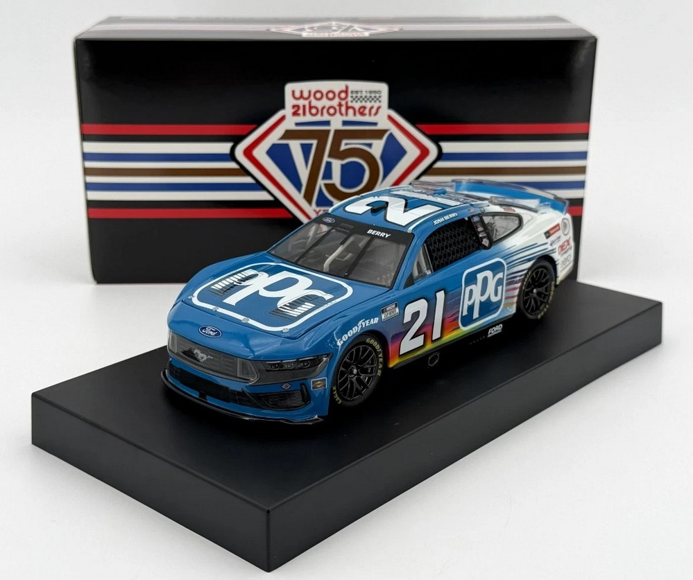 2025 Josh Berry #21 PPG / Ford Mustang NASCAR 1/24 diecast, by Action Lionel Racing. The Wood Brothers Racing #21 PPG Ford Mustang was raced to a top-10 finish by Josh Berry in the NASCAR Cup, Brickyard 400 at Indianapolis Motor Speedway on July 27, 2025.