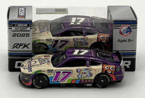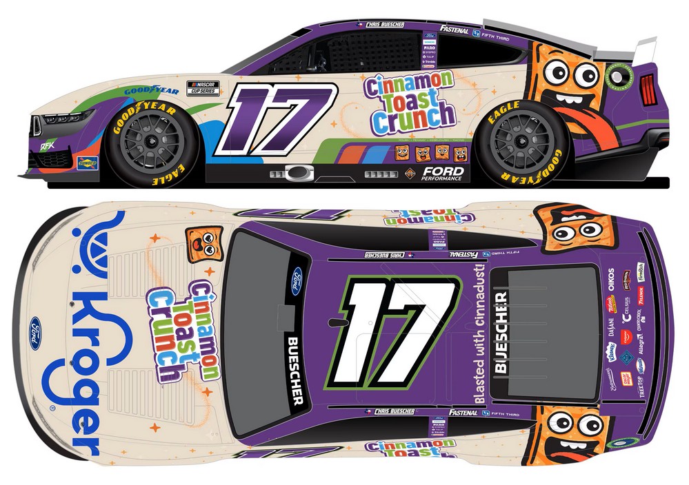 2025 Chris Buescher #17 Kroger / Cinnamon Toast Crunch / Ford Mustang NASCAR 1/64 diecast, by Action Lionel Racing. The RFK Roush Fenway Keselowski Racing #17 Kroger Cinnamon Toast Crunch Ford Mustang was raced to a top-10 finish by Chris Buescher in the NASCAR Cup, Quaker State 400 at Atlanta's Echopark Speedway on June 28, 2025. This is a foil number car.