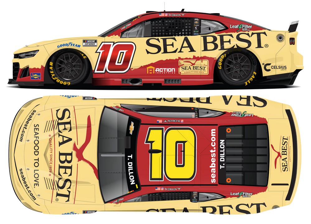 2025 Ty Dillon #10 Sea Best / Chevrolet Camaro ZL1 NASCAR 1/24 diecast, by Action Lionel Racing. The Kaulig Racing #10 Sea Best Chevrolet Camaro ZL1 was raced by Ty Dillon during the 2025 NASCAR Cup season. This is a foil number car.