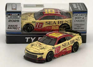 2025 Ty Dillon #10 Sea Best / Chevrolet Camaro ZL1 NASCAR 1/64 diecast, by Action Lionel Racing. The Kaulig Racing #10 Sea Best Chevrolet Camaro ZL1 was raced by Ty Dillon during the 2025 NASCAR Cup season. This is a foil number car.