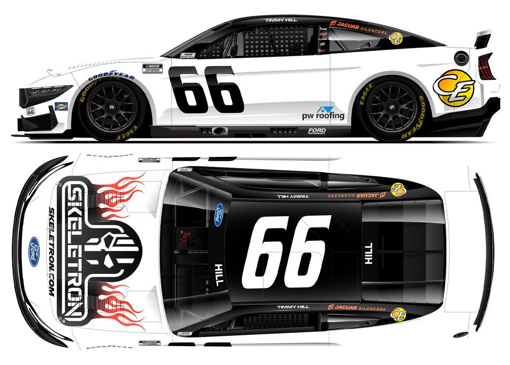 2025 Timmy Hill #66 Skeletron / Ford Mustang NASCAR 1/64 diecast, by Action Lionel Racing. The Garage 66 #66 Skeletron Ford Mustang was raced by Timmy Hill in the NASCAR Cup, Cook Out Southern 500 at Darlington Raceway on August 31, 2025. Skeletron, the toy design studio and creator of the action figure vehicle ROBOSKULL MKII, partnered with Garage 66 and driver Timmy Hill for the Southern 500 at Darlington Raceway.