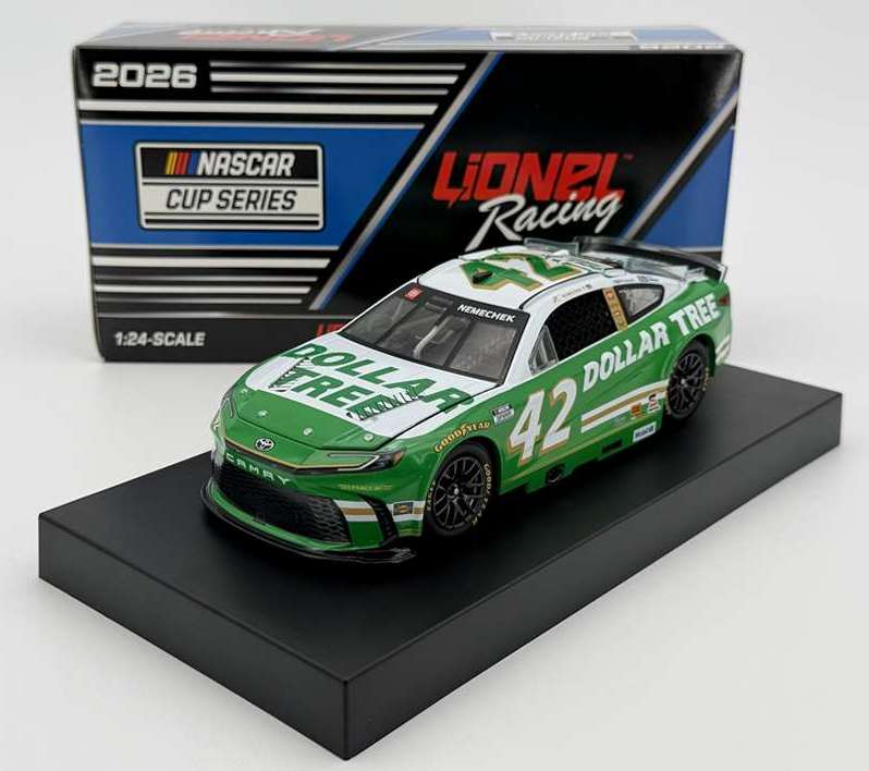 2026 John Hunter Nemechek #42 Dollar Tree / Toyota Camry XSE NASCAR 1/24 diecast, by Action Lionel Racing. The LEGACY Motor Club #42 Dollar Tree Toyota Camry XSE will be raced by John Hunter Nemechek in the NASCAR Cup, Daytona 500 at Daytona International Speedway on February 15, 2026.