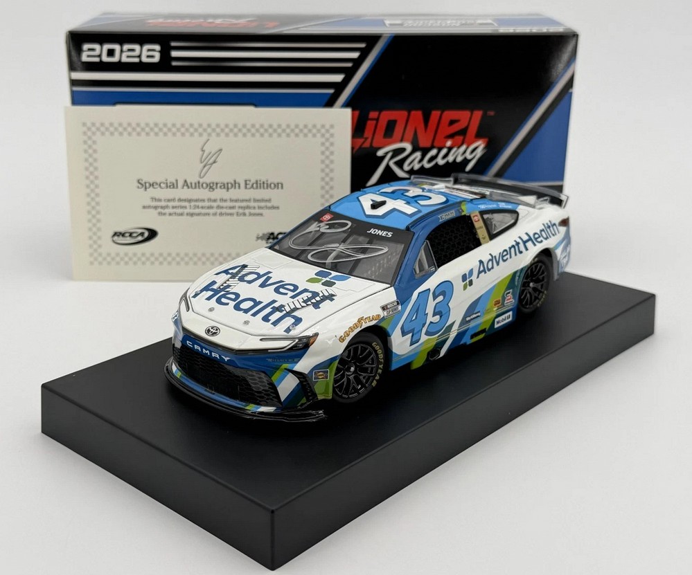 2026 Erik Jones #43 AdventHealth / Toyota Camry XSE NASCAR 1/24 diecast, by Action Lionel Racing. The LEGACY Motor Club #43 AdventHealth Toyota Camry XSE will be raced by Erik Jones during the 2026 NASCAR Cup season. --