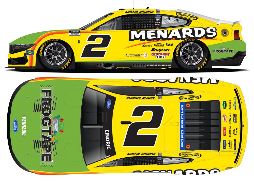 2026 Austin Cindric #2 Menards / FrogTape / Ford Mustang NASCAR 1/24 diecast, by Action Lionel Racing. The Team Penske #2 Menards FrogTape Ford Mustang will be raced by Austin Cindric in the NASCAR Cup, Jack Link's 500 at Talladega Superspeedway on April 26, 2026. FrogTape, a leading painter's tape brand available at Menards locations.