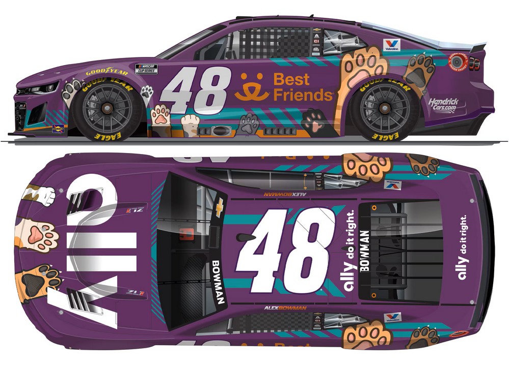 2026 Alex Bowman #48 ally / Best Friends Chevrolet ZL1 NASCAR 1/24 diecast, by Action Lionel Racing. The Hendrick Motorsports #48 ally Best Friends Animal Society Chevrolet ZL1 was raced by Anthony Alfredo in the NASCAR Cup, Straight Talk Wireless 500 at Phoenix Raceway on March 8, 2026. Alex Bowman was sidelined with vertigo. Since 2021, the partnership between Ally, Hendrick Motorsports, and Best Friends Animal Society has raised more than $1 million to help give pets second chances and happy homes.