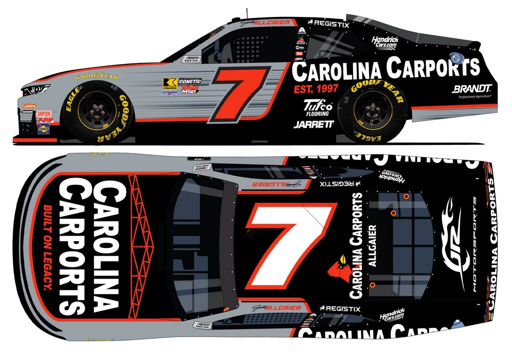 2026 Justin Allgaier #7 Carolina Carports / Chevrolet NASCAR 1/24 diecast, by Action Lionel Racing. The JR Motorsports #7 Carolina Carports Chevrolet will be raced by Justin Allgaier in select events during the 2026 NASCAR O'Reilly Auto Parts Series. Carolina Carports is a leading American metal building manufacturer.