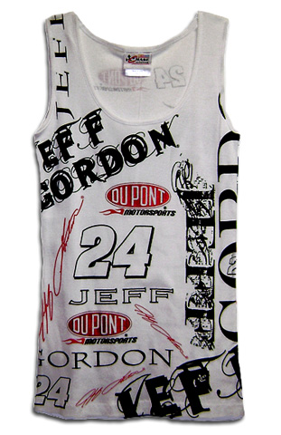 Jeff Gordon #24 Dupont Ladies Foil Enhanced Tank, by Chase Authentics. Officially licensed Jeff Gordon ladies white NASCAR ribbed tank, made of 100% cotton. Cute, crazy and comfortable, this flattering tank is wildly printed with Jeff Gordon's name, car number and Dupont Motorsports logos. This tank is screen printed with accented foil graphics.