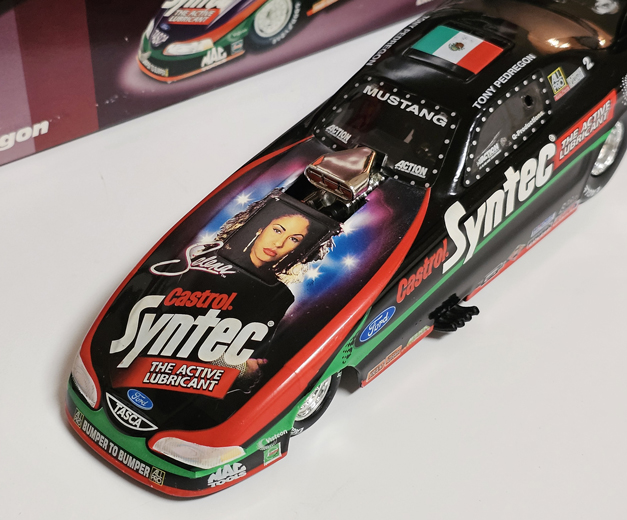 1998 Tony Pedregon / Castrol Syntec / Selena / Ford Mustang NHRA Winston Drag Racing Funny Car 1/24 diecast, by Action Performance. This John Force Racing Castrol Syntec Ford Mustang NHRA Funny car, featuring Selena, was raced by Tony Pedregon during the 1998 NHRA Winston Drag Racing Series season. Selena Quintanilla-Perez was an Mexican-American singer, referred to as the "Queen of Tejano Music." Selena was shot and killed on March 31, 1995.