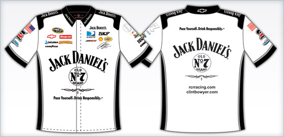 #07 Clint Bowyer / Jack Daniel's NASCAR Pit Crew Shirt, by JH Design. Officially licensed Jack Daniel's adult NASCAR pit shirt, made of 65% polyester 35% cotton body and 100% polyester lining. The Jack Daniel's pit shirt is decorated in team colors and designed with full-color appliqué driver and team graphics embroidered on the chest, back, neck, sleeves and shoulders. This Jack Daniel's pit shirt has a convenient snap-front placket and comfortable fold-down collar.
