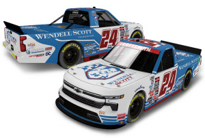 2023 Rajah Caruth #24 Wendell Scott Foundation / Chevrolet Silverado NASCAR Truck 1/24 diecast, by Action Lionel. The GMS Racing #24 Wendell Scott Foundation Chevrolet Silverado truck was raced by Rajah Caruth during the 2023 NASCAR Craftsman Truck Series season.