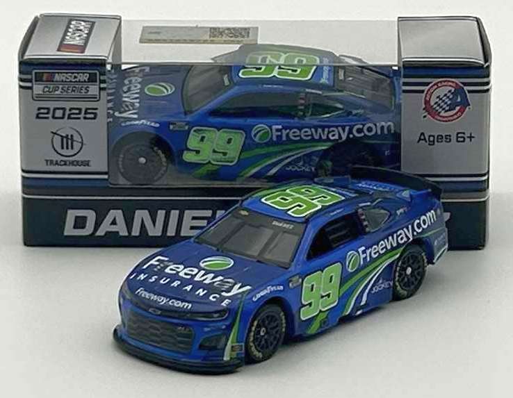 2025 Daniel Suarez #99 Freeway Insurance Blue / Chevrolet Camaro ZL1 NASCAR 1/64 diecast, by Action Lionel. The Trackhouse Racing #99 Freeway Insurance Blue Chevrolet Camaro ZL1 will be raced by Daniel Suarez during the 2025 NASCAR Cup season. This is a foil number car.