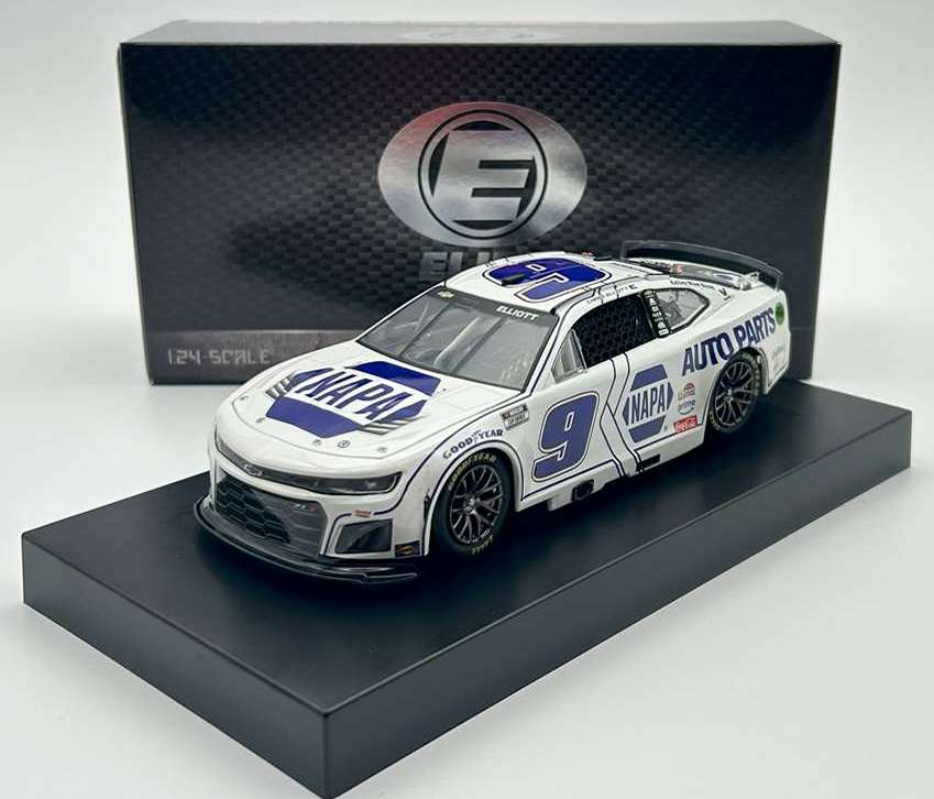 2025 Chase Elliott #9 NAPA White / Chevrolet Camaro ZL1 NASCAR ELITE 1/24 diecast, by Action Lionel. The Hendrick Motorsports #9 NAPA Auto Parts White Chevrolet Camaro ZL1 was raced to victory by Chase Elliott in the NASCAR Cup, Cook Out Clash at Bowman Gray Stadium on February 2, 2025. --