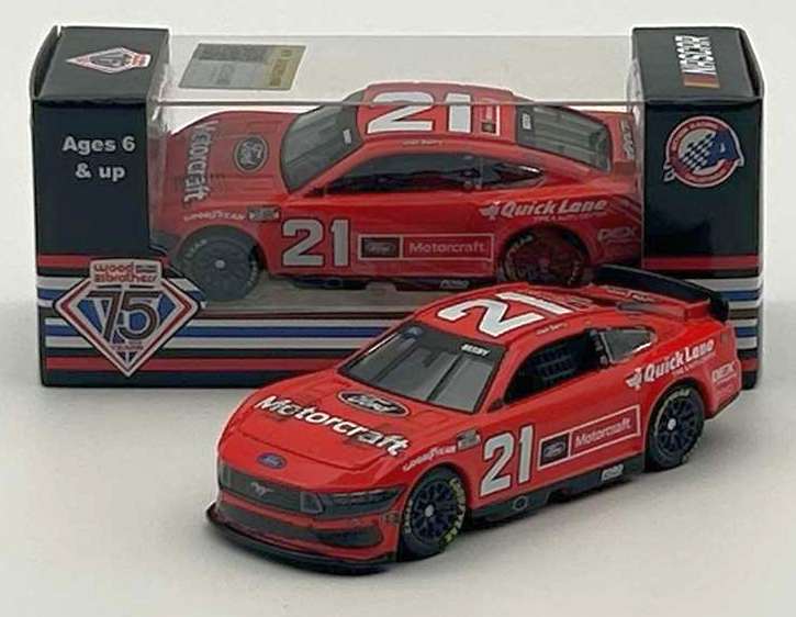 2025 Josh Berry #21 Motorcraft "Backseater" / Ford Mustang NASCAR 1/64 diecast, by Action Lionel. The Wood Brothers Racing #21 Motorcraft "Backseater" Ford Mustang was raced by Josh Berry in the NASCAR Cup, Cook Out Clash at Bowman Gray Stadium on February 2, 2025. This livery harkens back to Glen Wood's "Backseater" Modified that took victories at Bowman Gray in the 1950s and 1960s.