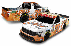 2025 Parker Kligerman #75 Spiked Coolers / Daytona / Raced Version / Chevrolet Silverado NASCAR Truck 1/24 diecast, by Action Lionel. Parker Kligerman raced this Henderson Motorsports #75 Spiked Coolers Chevrolet Silverado truck to victory in the NASCAR Craftsman Truck Series, Fresh From Florida 250 at Daytona International Speedway on February 14, 2025. The win was taken from Parker Kligerman, because the truck did not pass post-race inspection when competition officials found that it failed to meet ride-height requirements.