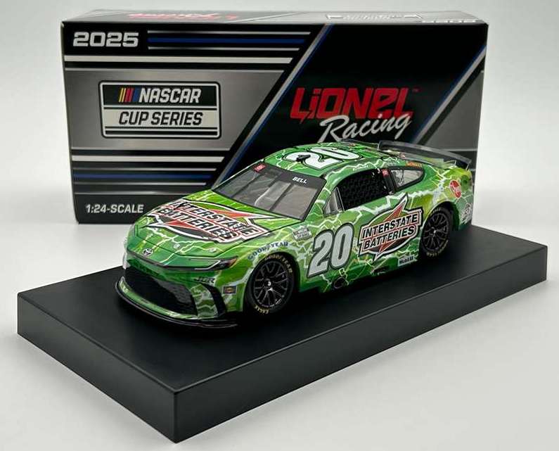 2025 Christopher Bell #20 Interstate Batteries / Toyota Camry XSE NASCAR 1/24 diecast, by Action Lionel. The Joe Gibbs Racing #20 Interstate Batteries Toyota Camry XSE will be raced by Christopher Bell in 2 events during the 2025 NASCAR Cup season, Las Vegas in March and Texas in May. --