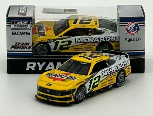 2025 Ryan Blaney #12 Pennzoil / Ford Mustang NASCAR 1/64 diecast, by Action Lionel. The Team Penske #12 Pennzoil Menards Ford Mustang was raced by Ryan Blaney in 2 events during the 2025 NASCAR Cup season.