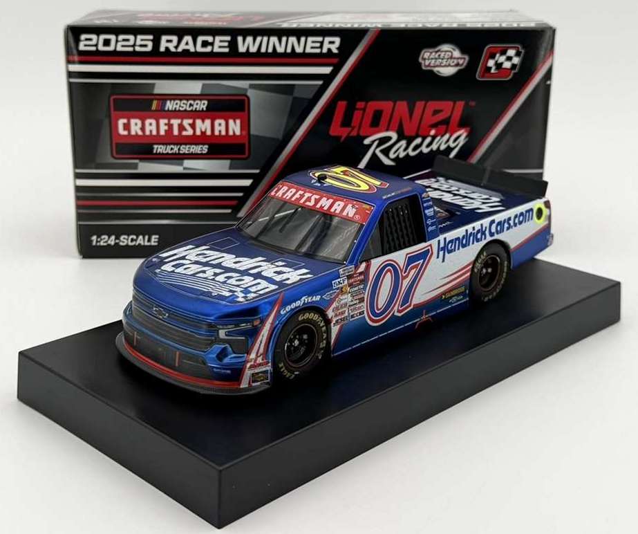 2025 Kyle Larson #07 HendrickCars.com / Homestead Win / Raced Version / Chevrolet Silverado NASCAR Truck 1/24 diecast, produced with a Color Chrome special finish by Action Lionel. Kyle Larson raced this Spire Motorsports #07 HendrickCars.com Chevrolet Silverado to victory in the NASCAR Craftsman Truck Series, Baptist Health 200 at Homestead-Miami Speedway on March 21, 2025.