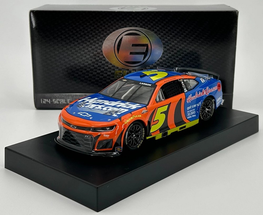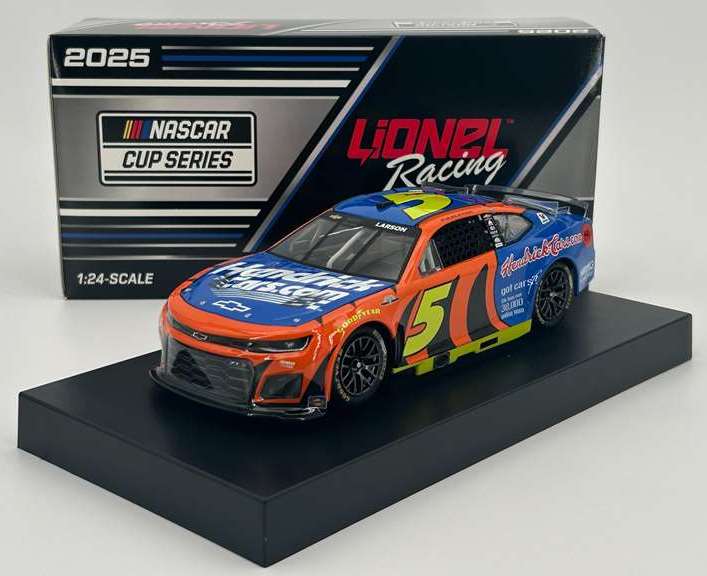 2025 Kyle Larson #5 HendrickCars.com / Darlington Throwback / Chevrolet Camaro ZL1 NASCAR 1/24 diecast, by Action Lionel. The Hendrick Motorsports #5 HendrickCars.com Darlington Throwback Chevrolet Camaro ZL1 was raced by Kyle Larson in the NASCAR Cup, Goodyear 400 at Darlington Raceway on April 6, 2025. This tiger-striped livery replicates Terry Labonte's 2003 Darlington-winning car, which was the 22nd and final victory of his Hall of Fame career.