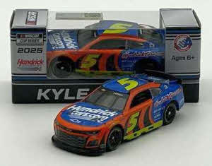 2025 Kyle Larson #5 HendrickCars.com / Darlington Throwback / Chevrolet Camaro ZL1 NASCAR 1/64 diecast, by Action Lionel. The Hendrick Motorsports #5 HendrickCars.com Darlington Throwback Chevrolet Camaro ZL1 was raced by Kyle Larson in the NASCAR Cup, Goodyear 400 at Darlington Raceway on April 6, 2025. This tiger-striped livery replicates Terry Labonte's 2003 Darlington-winning car, which was the 22nd and final victory of his Hall of Fame career.